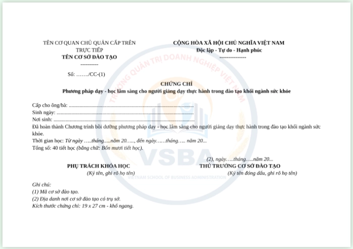 Mẫu chứng chỉ phương pháp dạy học lâm sàng (Tham khảo)