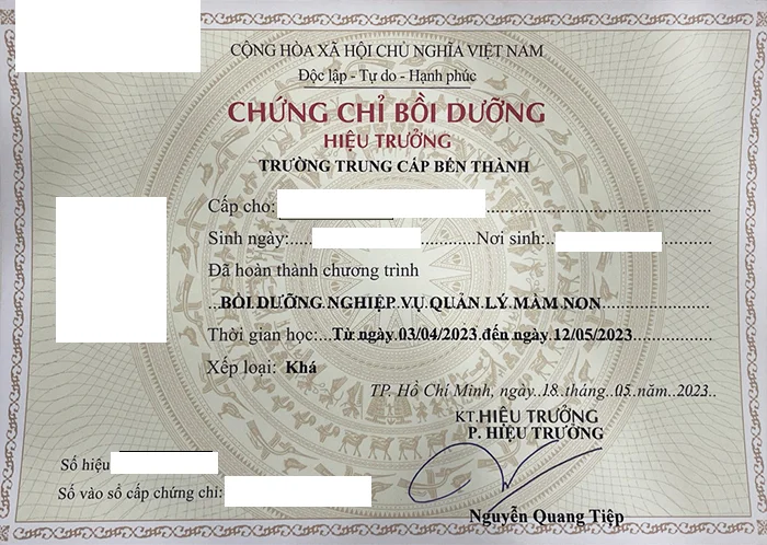 Mẫu chứng chỉ nghiệp quản lý mầm non - Trường Trung cấp Bến Thành (Tham khảo)