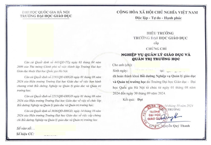 Mẫu chứng chỉ nghiệp vụ quản lý giáo dục và quản trị trường học - Trường Đại học Giáo dục ĐHQGHN (Tham khảo)