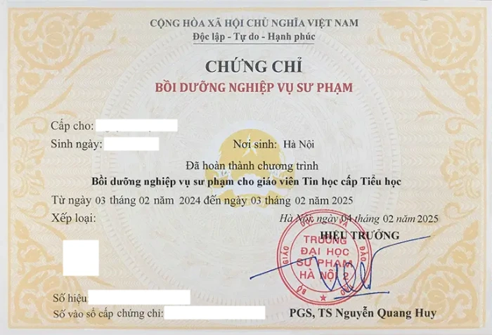 Mẫu chứng chỉ Nghiệp vụ Sư phạm Tiểu học - Trường Đại học Sư phạm Hà Nội 2 (Tham khảo)
